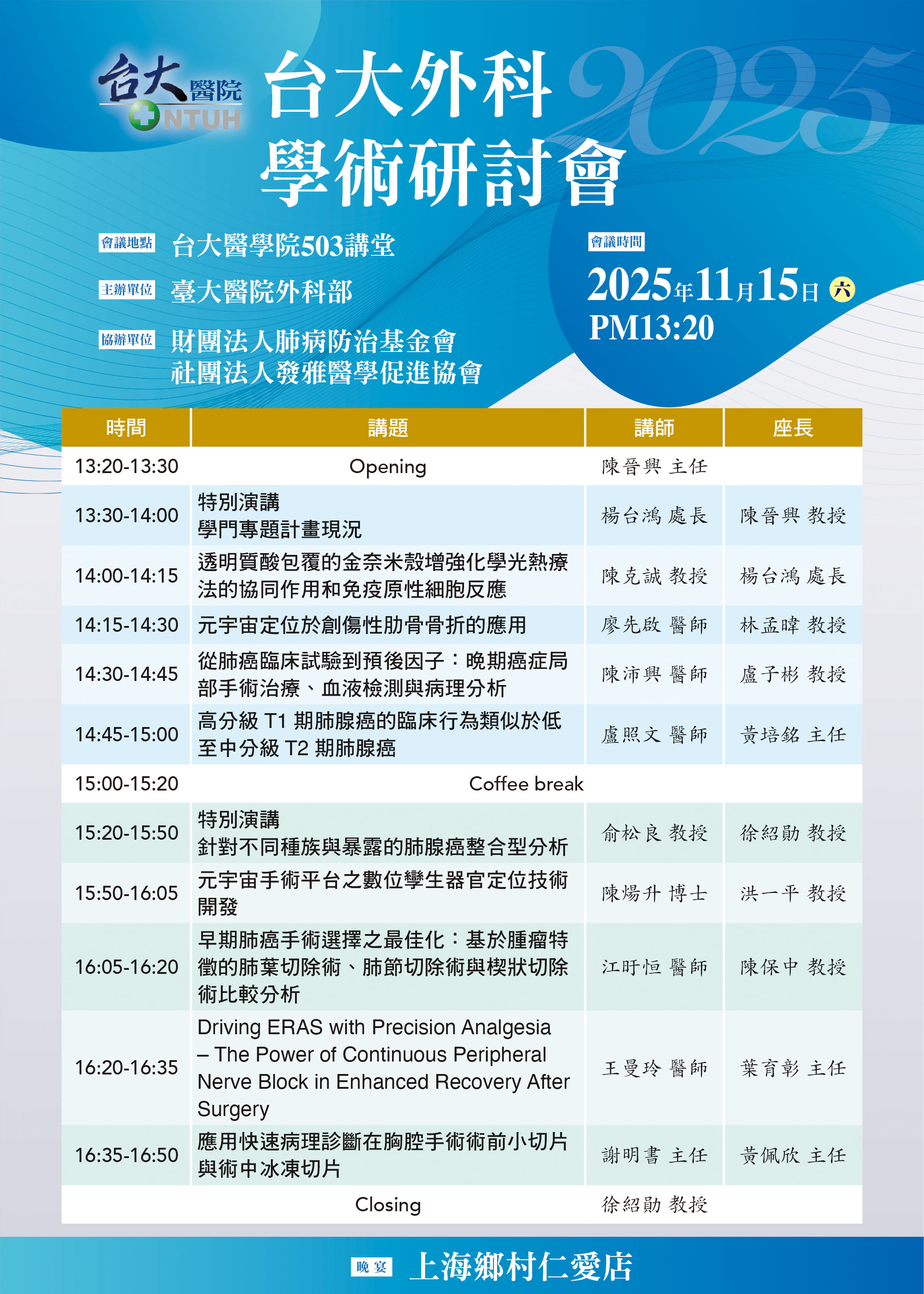 所有活動 11/15/2025 00:00 ~ 23:59 國內學術活動 2025 台大外科學術研討會 台大醫學院503講堂 參加對象 醫師及醫護相關人員 主辦單位 台大醫院外科部 聯絡資訊 聯 絡 人 無 電子信箱 無 聯絡電話 無 傳 真 無 繼續教育 核准字號 1140071 本會一般積分 2 分 本會時數 4 小時 分享 Facebbok google plus Twitter Plurk LINE 活動清單