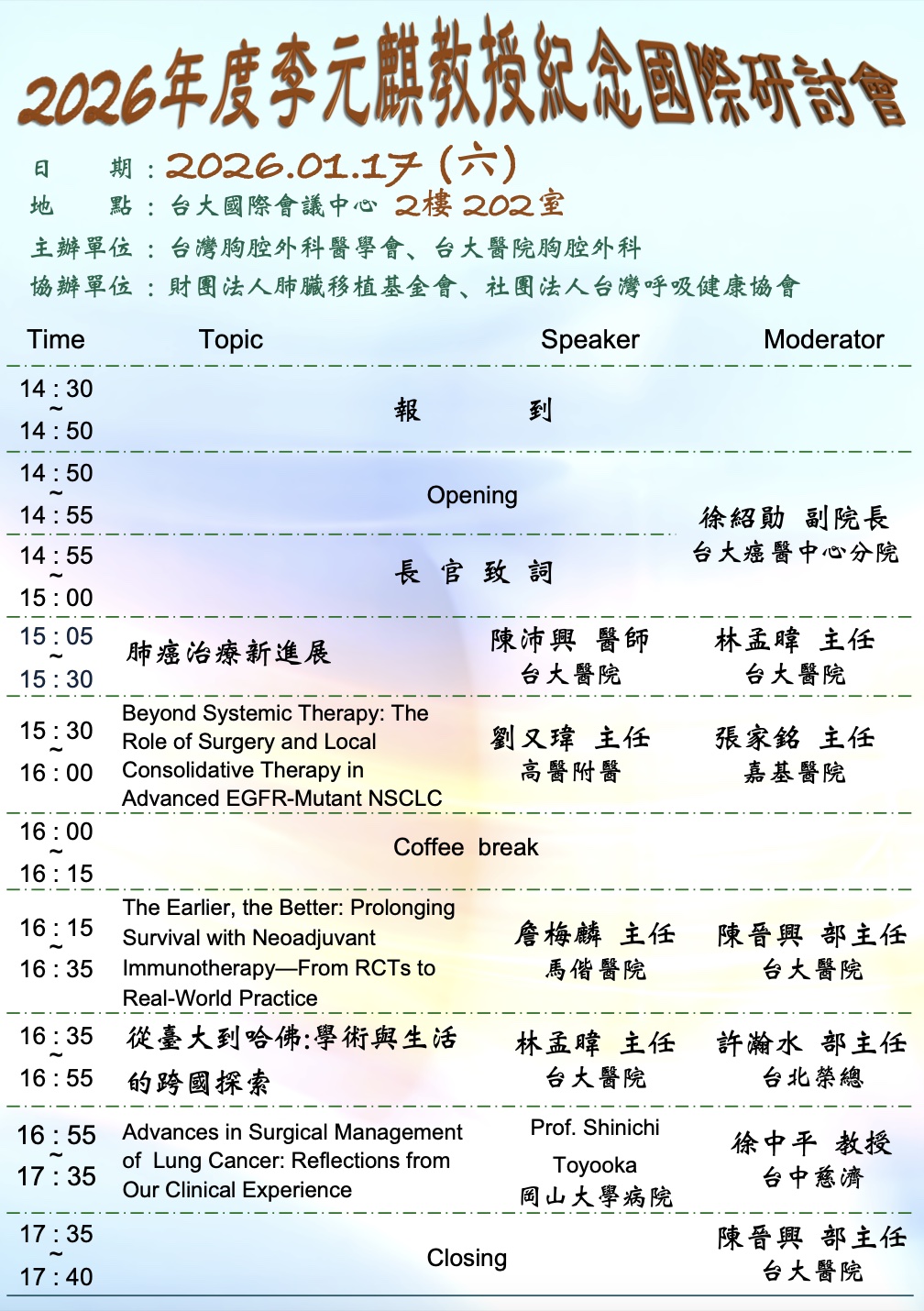 | 主辦單位 | 台灣胸腔外科醫學會、台大醫院胸腔外科 |