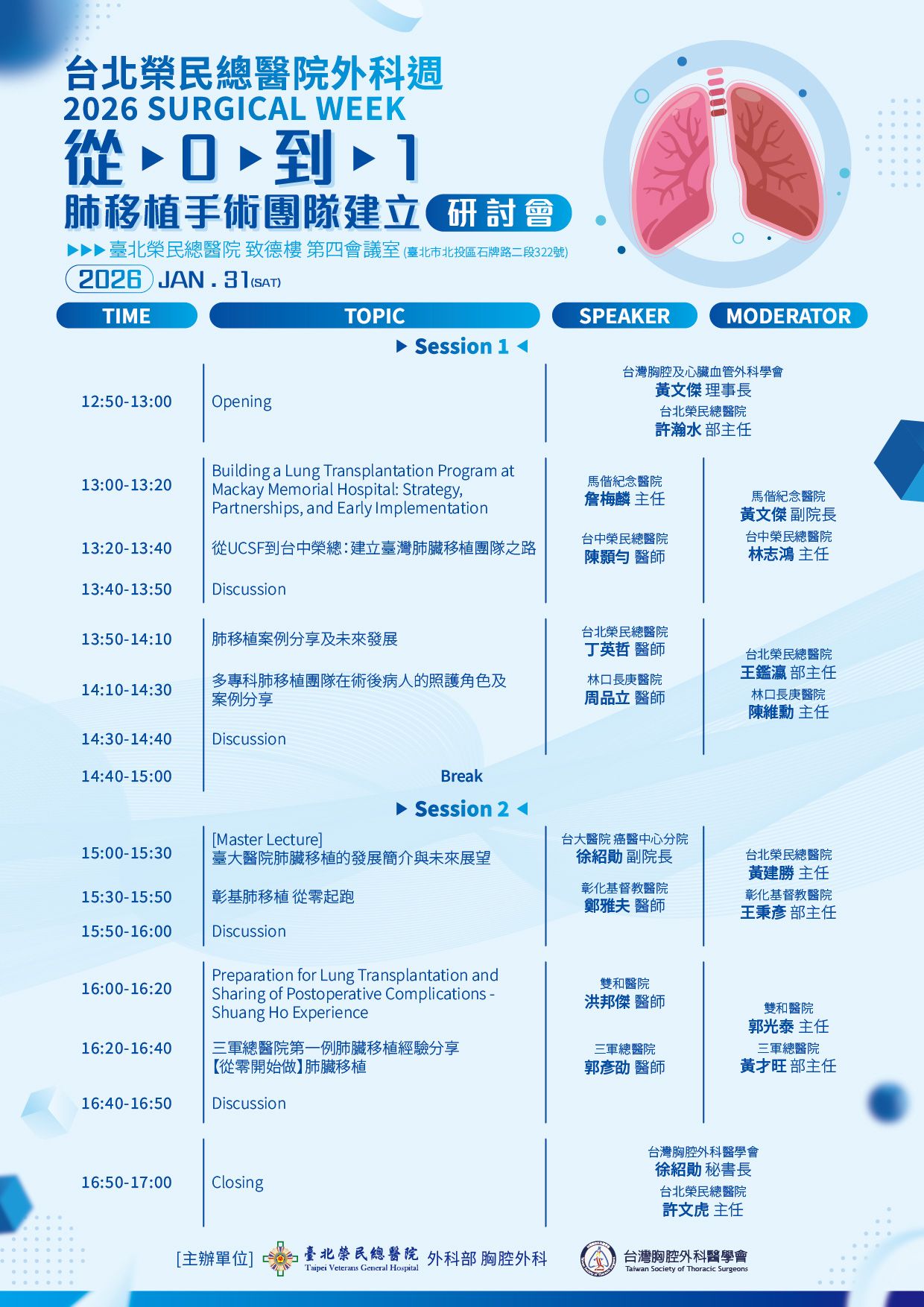 | 主辦單位 | 台北榮民總醫院、台灣胸腔外科醫學會 |