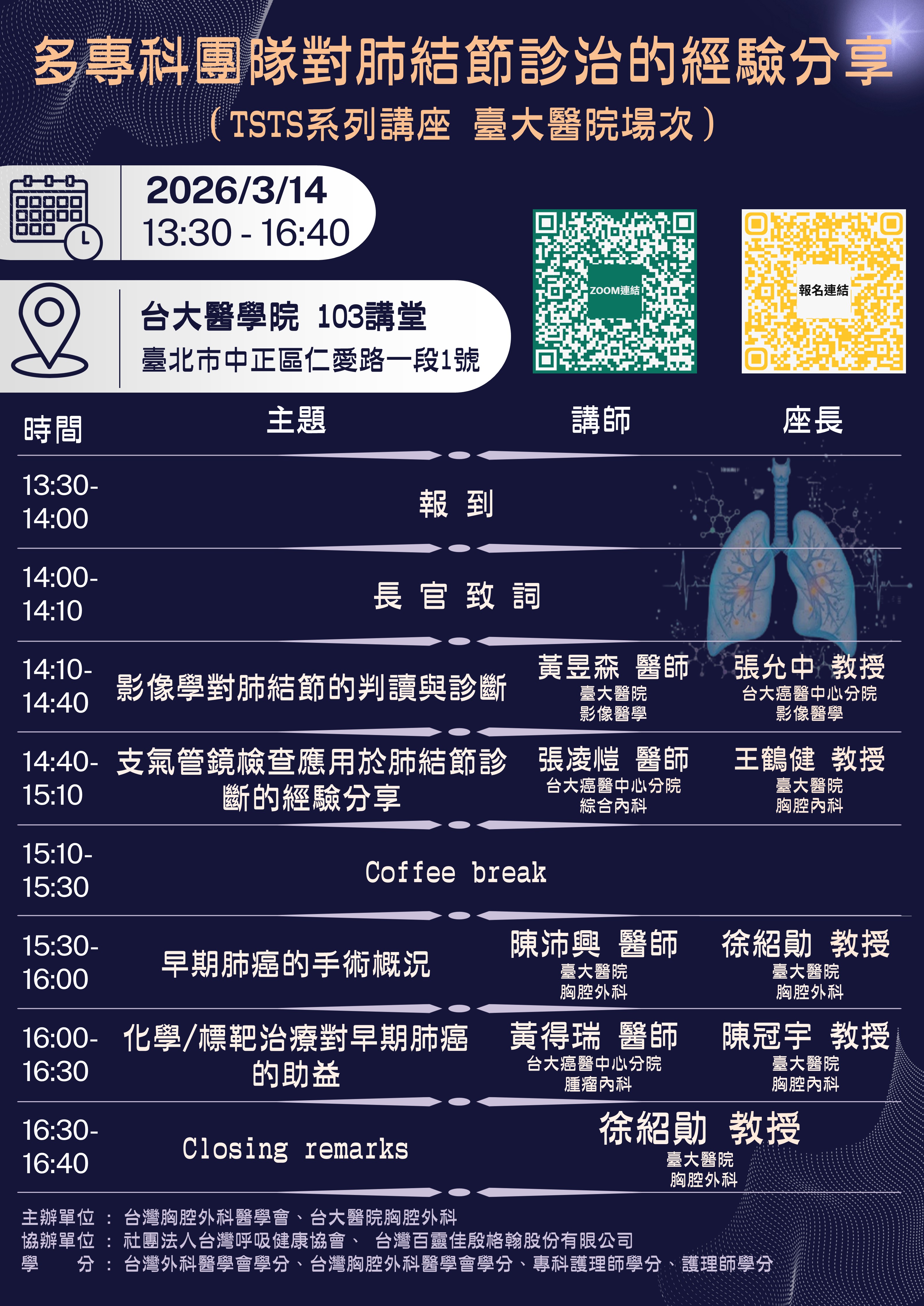 | 主辦單位 | 台灣胸腔外科醫學會、台大醫院 |
