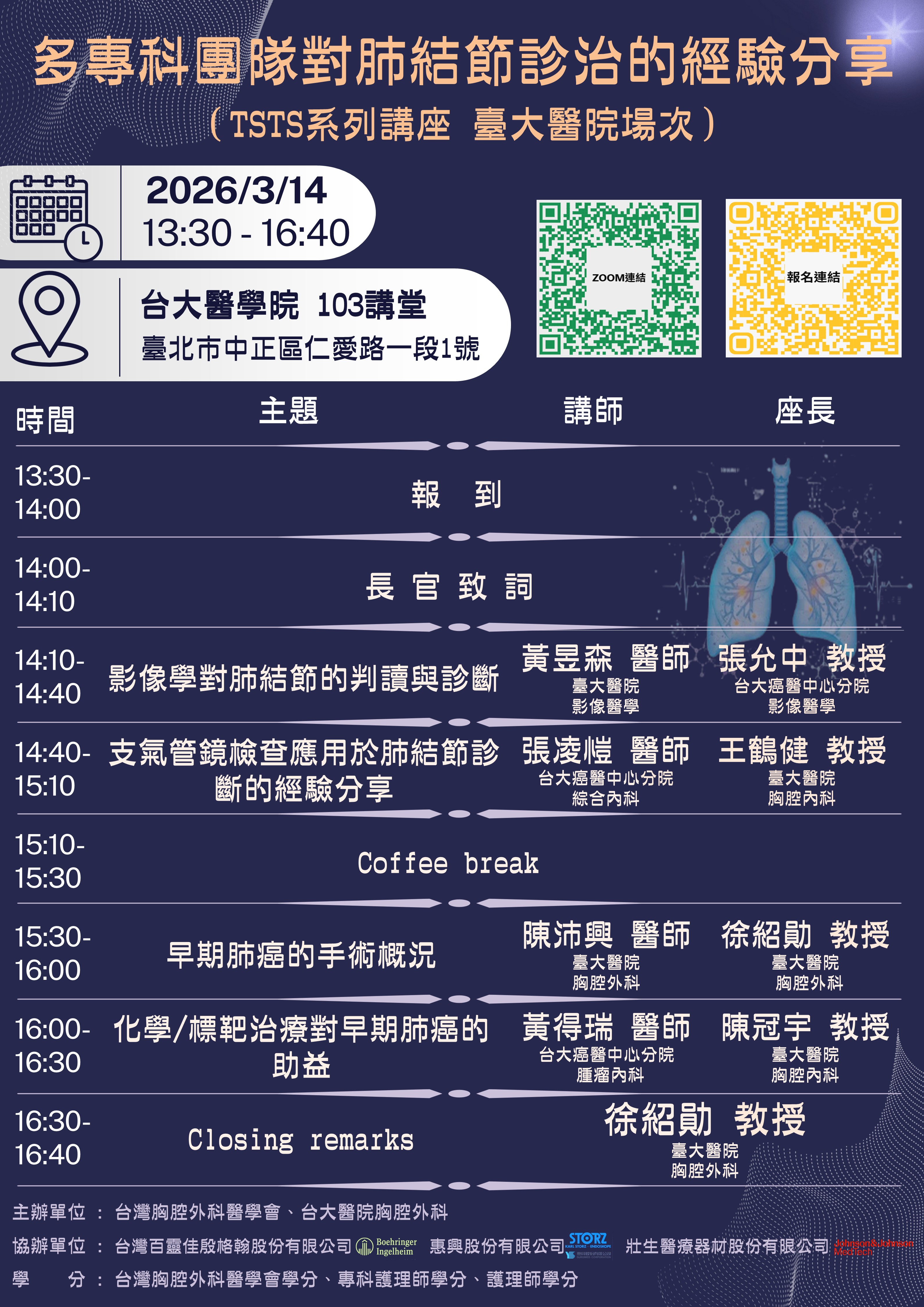 | 主辦單位 | 台灣胸腔外科醫學會、台大醫院胸腔外科 |