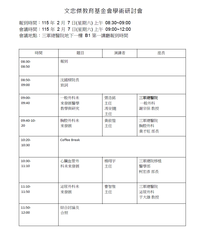 所有活動 02/07/2026 08:30 ~ 12:00 國內學術活動 文忠傑教育基金會學術研討會 三軍總醫院B1 第一演講廳 (台北市內湖區成功路二段325號) 主辦單位 三軍總醫院外科部 聯絡資訊 聯 絡 人 無 電子信箱 無 聯絡電話 無 傳 真 無 繼續教育 核准字號 1150003 本會一般積分 1.5 分 本會時數 0 小時 分享 Facebbok google plus Twitter Plurk LINE 活動清單