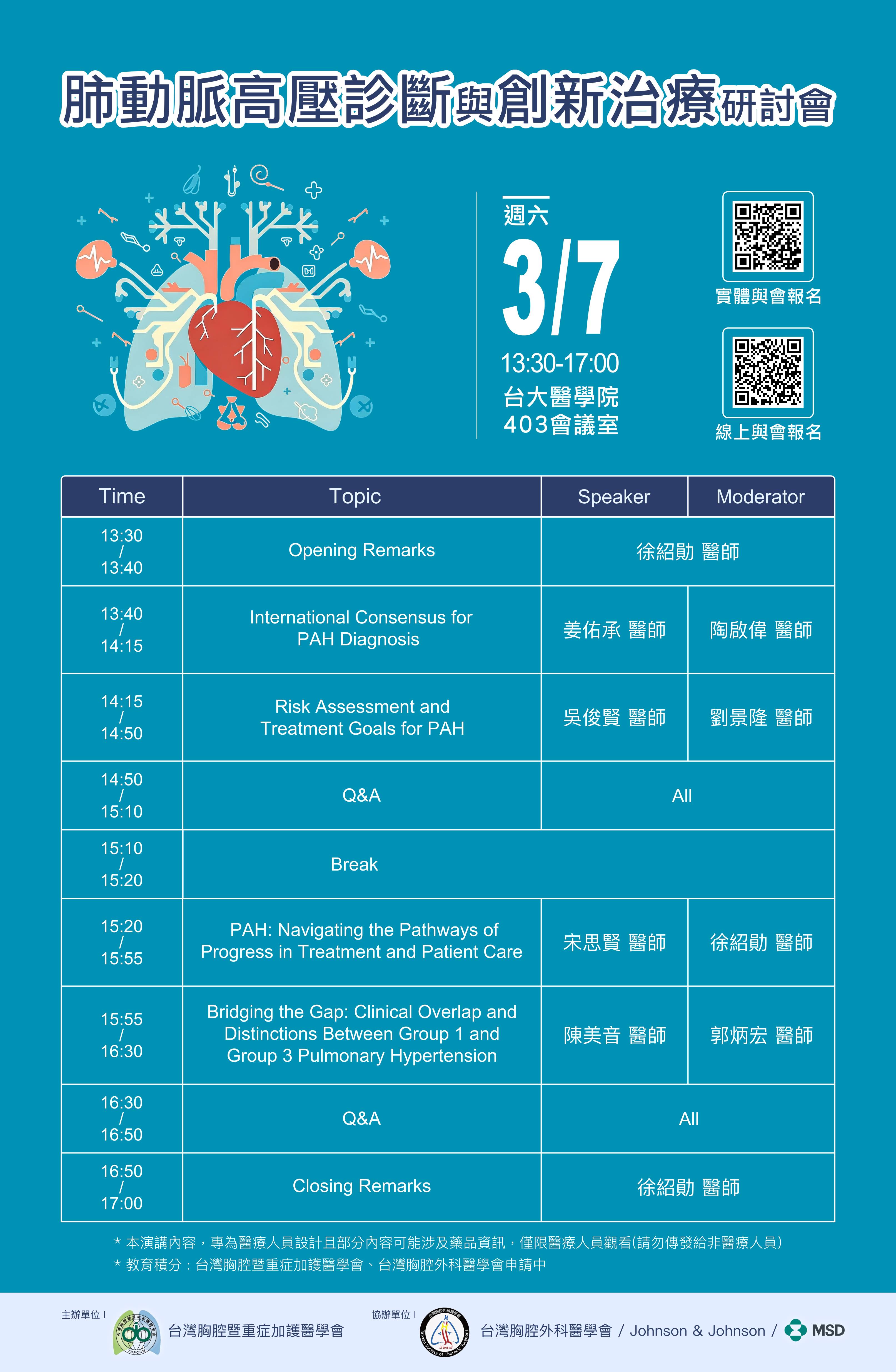所有活動 03/07/2026 13:30 ~ 17:00 國內學術活動 肺動脈高壓診斷與創新治療研討會 台大醫學會 403會議室 主辦單位 台灣胸腔暨重症加護醫學會 聯絡資訊 聯 絡 人 無 電子信箱 無 聯絡電話 無 傳 真 無 繼續教育 核准字號 1150006 本會一般積分 2 分 本會時數 0 小時 分享 Facebbok google plus Twitter Plurk LINE 活動清單