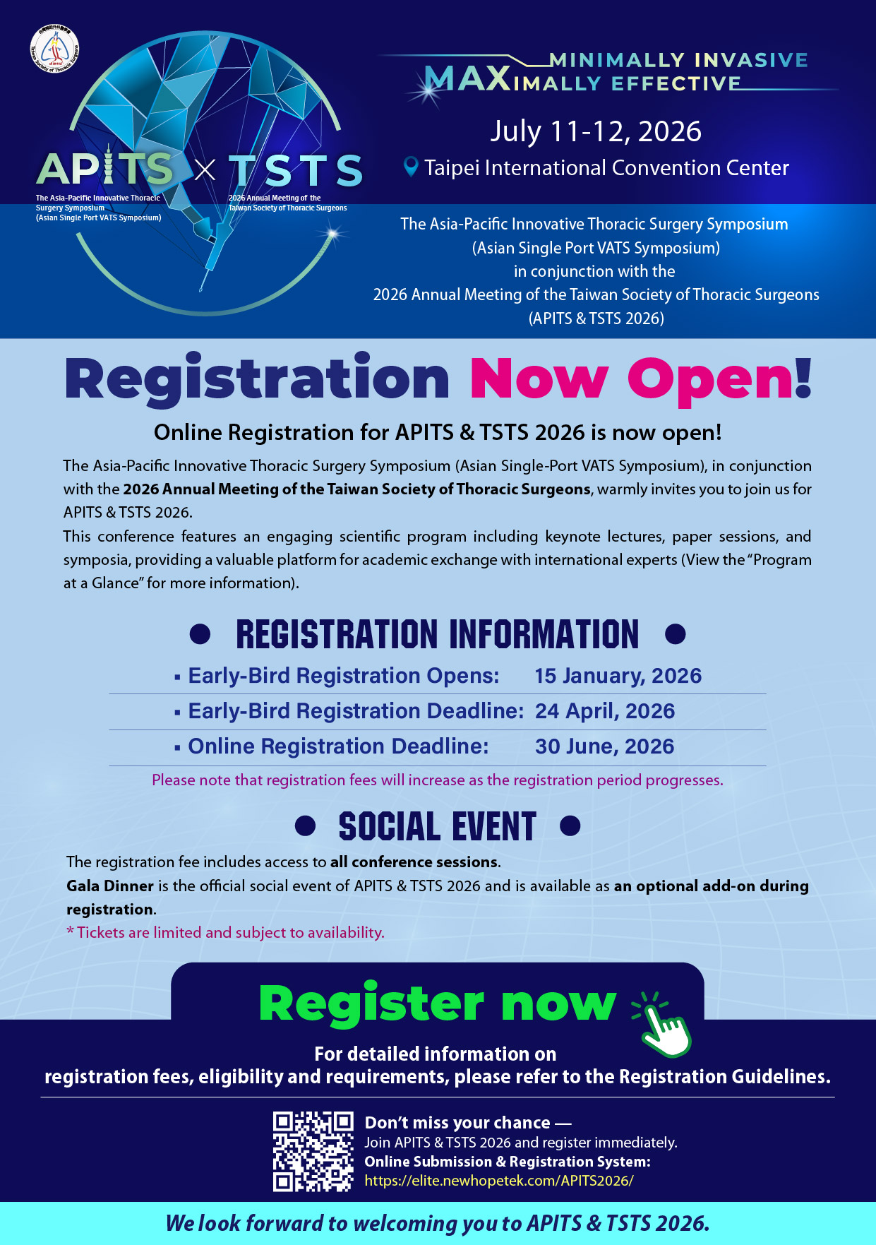 2026年亞太胸腔手術創新論壇(APITS)暨台灣胸腔外科醫學會(TSTS)年度大會及會員大會(APITS & TSTS 2026)將於2026年7月11日至12日在台北國際會議中心(TICC)盛大舉行。