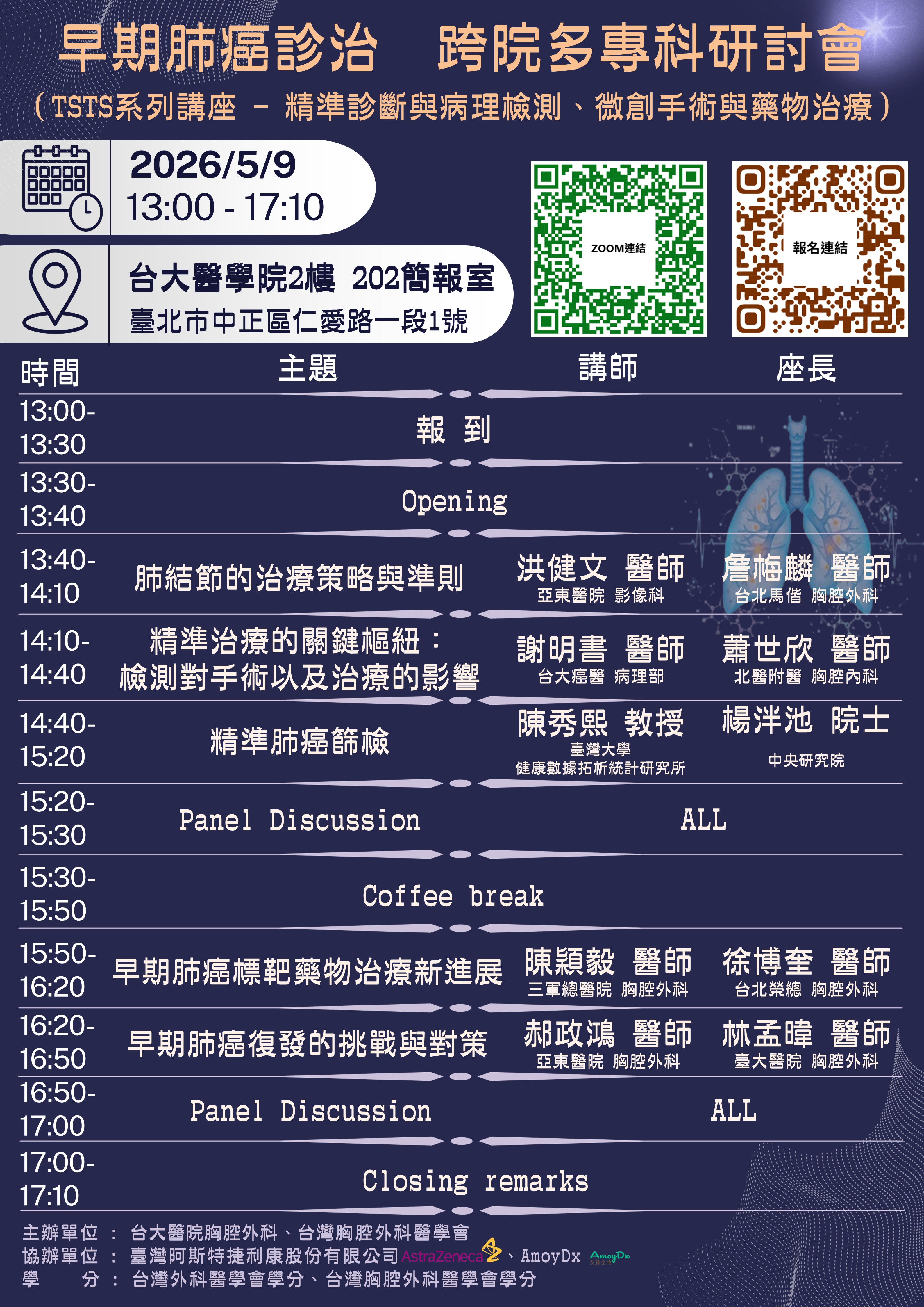 | 主辦單位 | 台大醫院胸腔外科、台灣胸腔外科醫學會 |