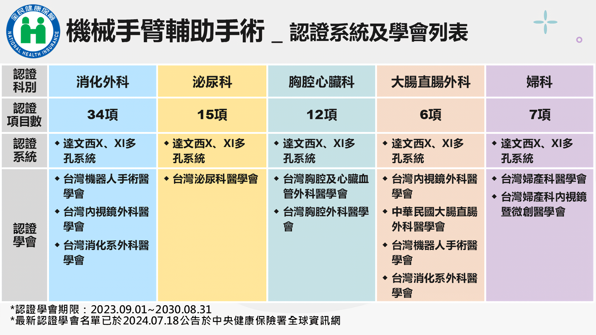 2025/07/18 衛生福利部健康保險署專區 機械手臂輔助手術認證學會名單暨器官系統認證術式醫令範圍列表(114.7.18製作) 瀏覽次數:1599 認證學會名單暨器官系統認證術式醫令範圍列表 114.7/18 更新,請參酌附件 資料來源:https://www.nhi.gov.tw/ch/cp-18599-bbcc5-3983-1.html 附加檔案 機械手臂輔助手術認證學會名單暨器官系統認證術式醫令範圍列表(114.07.18) 分享 Facebbok google plus Twitter Plurk LINE 訊息清單