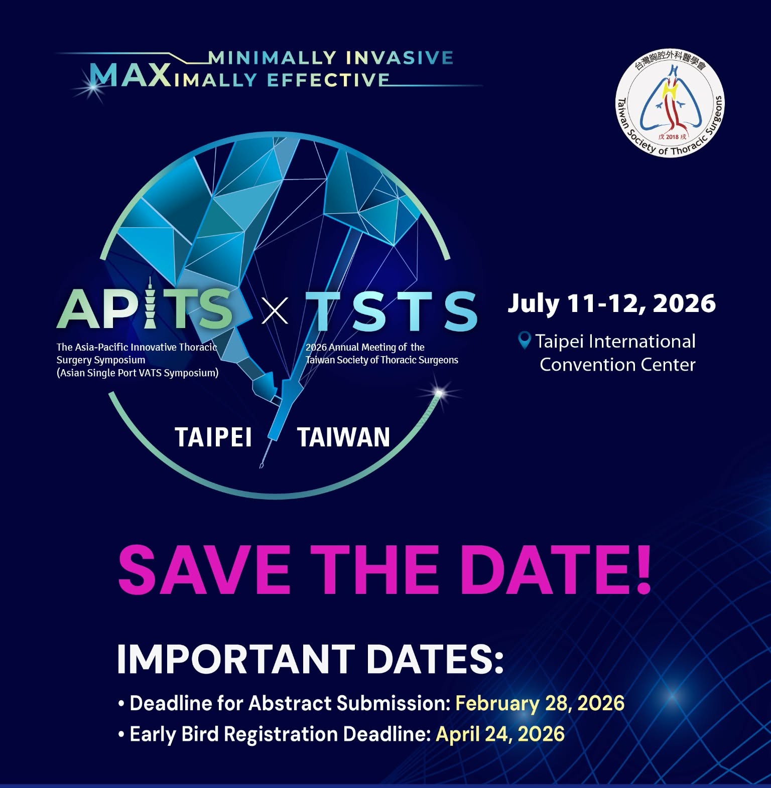 2026/02/02 學會公告 2026 APITS & TSTS -- Call for Abstracts & Registration ~Now Open!! 瀏覽次數:1296 2026 APITS & TSTS 官網:https://apits2026.org (網頁最新資訊將持續更新,謝謝) 分享 Facebbok google plus Twitter Plurk LINE 訊息清單