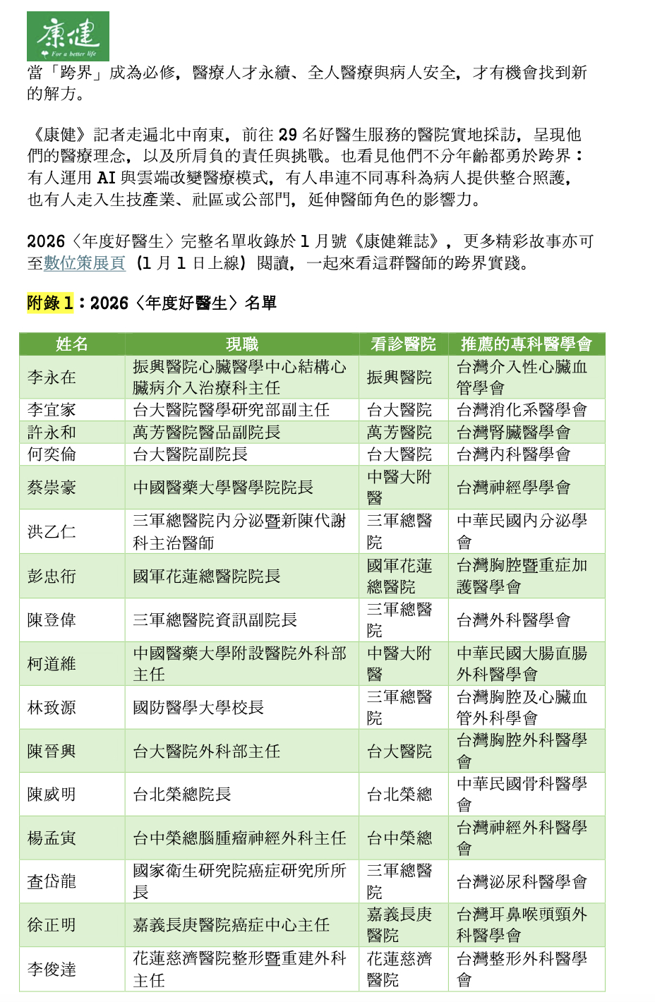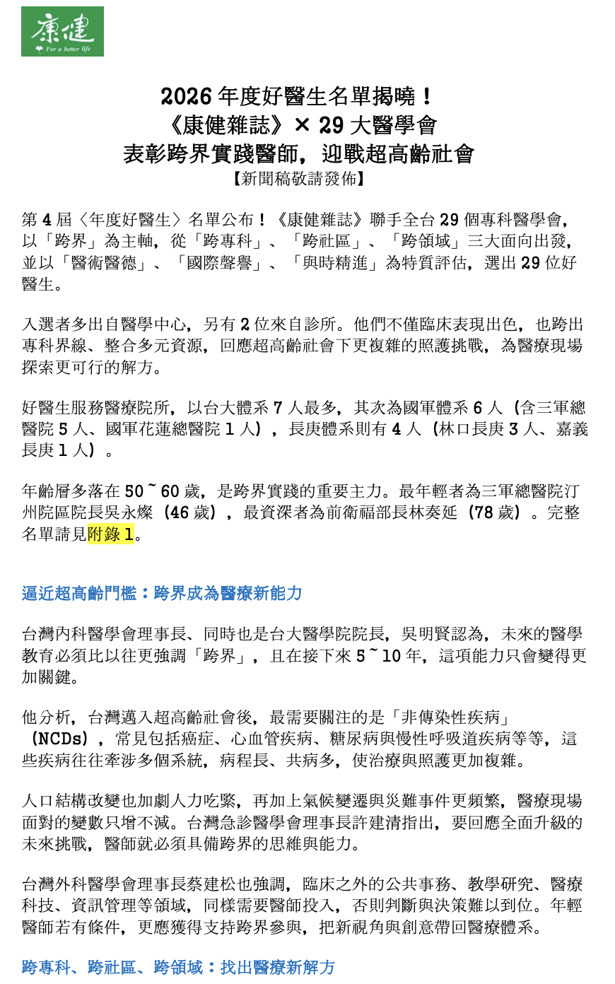 2026/01/02 學會公告 2026年度好醫生榜單揭曉 : 29大醫學會表彰跨界醫療菁英,迎戰超高齡社會 瀏覽次數:498 相關網址http://www.commonhealth.com.tw/article/93447 分享 Facebbok google plus Twitter Plurk LINE 訊息清單